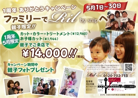 家族でRil by snipへ | 美容室 Snip(スニップ) | 美容室 Snip(スニップ) | 大阪、都島区、城東区、北区、中崎町、だいどう豊里、南巽、西区に10店舗を展開する美容室です。