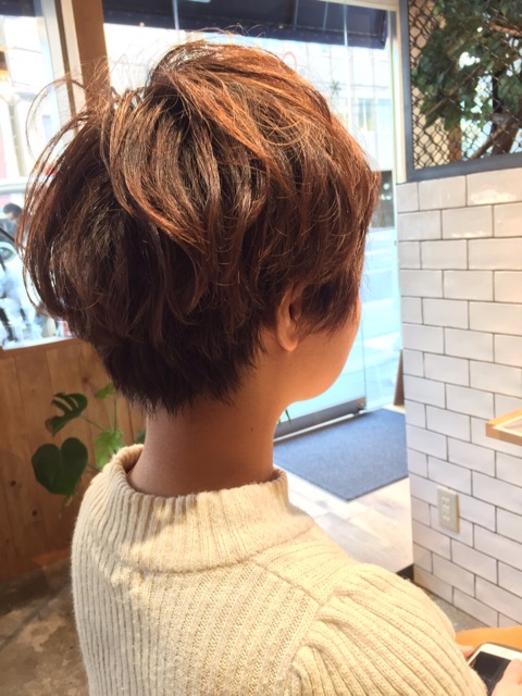すそはスッキリと上はふんわりしたいということで、パーマでトップにパーマをあてました
